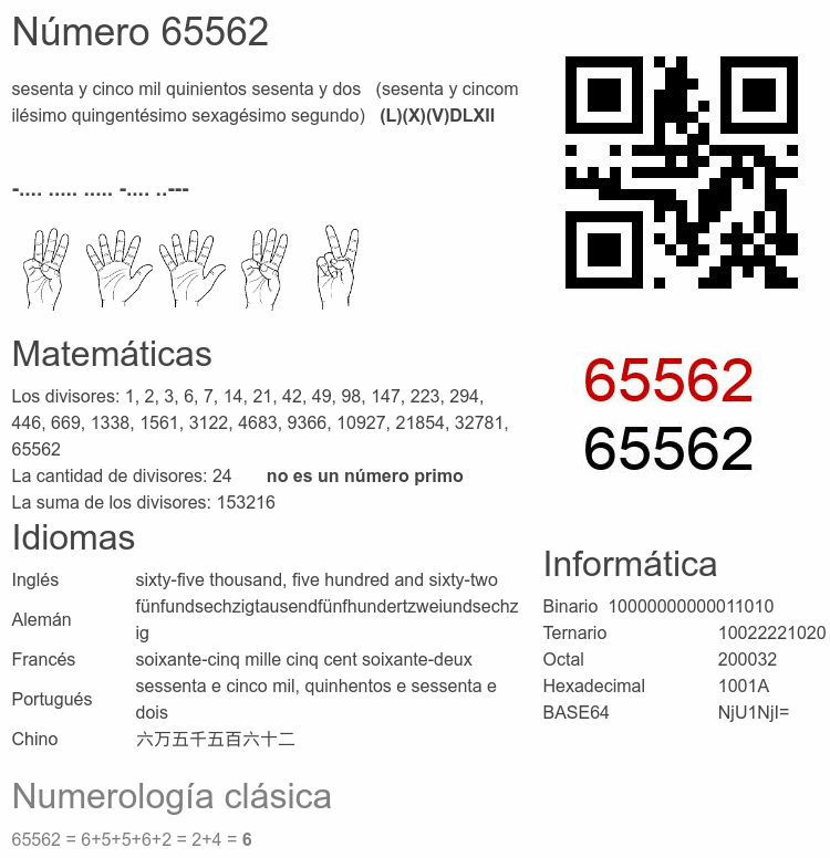Si conoce algo interesante sobre el número 65562 o cualquier número natural (entero positivo), por favor escríbanos.Número 65 562 en otras unidades