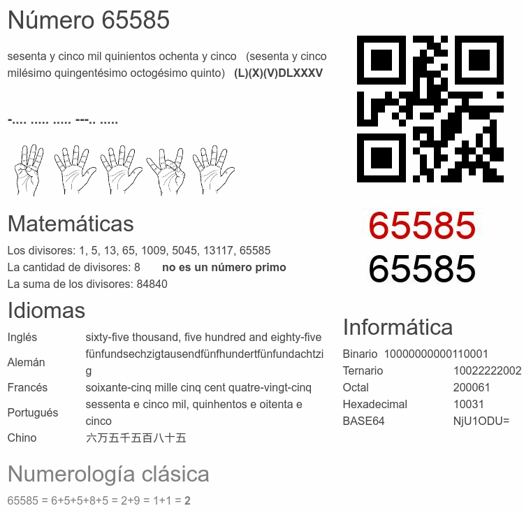 | Ruso: | 🔊 (номер 65 585) | шестьдесят пять тысяч пятьсот восемьдесят пять |