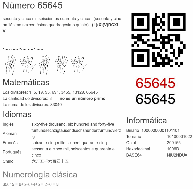 Si conoce algo interesante sobre el número 65645 o cualquier número natural (entero positivo), por favor escríbanos.Número 65 645 en otras unidades