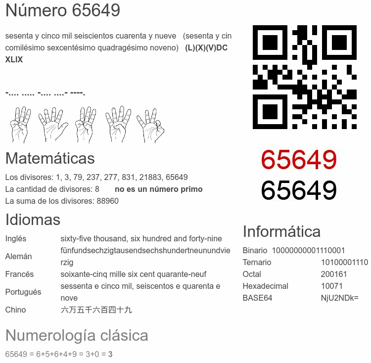 Si conoce algo interesante sobre el número 65649 o cualquier número natural (entero positivo), por favor escríbanos.Número 65 649 en otras unidades
