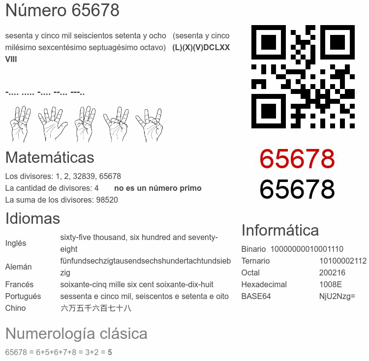 Si conoce algo interesante sobre el número 65678 o cualquier número natural (entero positivo), por favor escríbanos.Número 65 678 en otras unidades