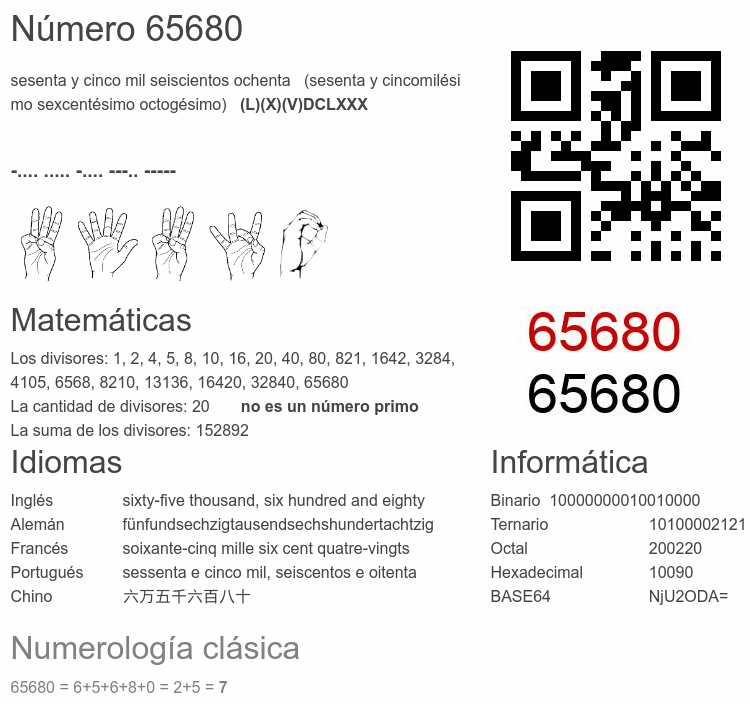 Si conoce algo interesante sobre el número 65680 o cualquier número natural (entero positivo), por favor escríbanos.Número 65 680 en otras unidades