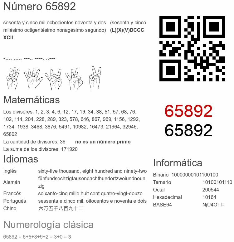 Si conoce algo interesante sobre el número 65892 o cualquier número natural (entero positivo), por favor escríbanos.Número 65 892 en otras unidades