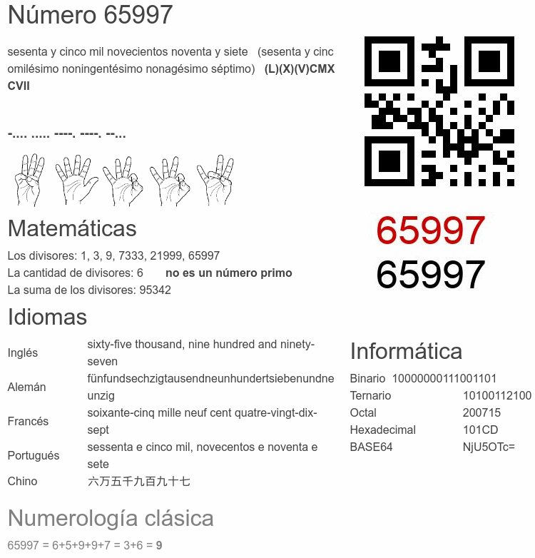 Si conoce algo interesante sobre el número 65997 o cualquier número natural (entero positivo), por favor escríbanos.Número 65 997 en otras unidades
