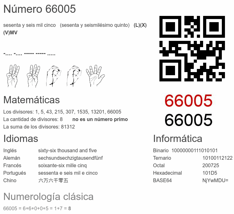 | Francés: | 🔊 (nombre 66 005) | soixante-six mille cinq |