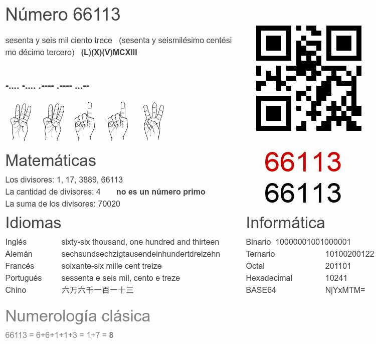 Si conoce algo interesante sobre el número 66113 o cualquier número natural (entero positivo), por favor escríbanos.Número 66 113 en otras unidades