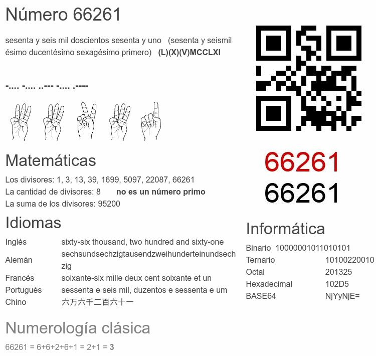 Si conoce algo interesante sobre el número 66261 o cualquier número natural (entero positivo), por favor escríbanos.Número 66 261 en otras unidades