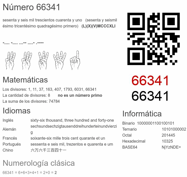 Si conoce algo interesante sobre el número 66341 o cualquier número natural (entero positivo), por favor escríbanos.Número 66 341 en otras unidades