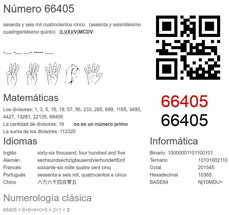 El número impar 66 405 se dice 🔊, y se escribe con las palabras: sesenta y seis mil cuatrocientos cinco. El número ordinal 66405.° se dice 🔊 y se escribe como: sesenta y seismilésimo cuadrigentésimo quinto. El significado del número 66405 en Matemáticas: Es un primo? Factorización y árbol de factores primos. La raíz cuadrada de y la raíz cúbica de 66405. El significado en informática, numerología, códigos e imágenes, escritura y denominación en otras lenguas. Otras curiosidades relacionadas con el 66405.