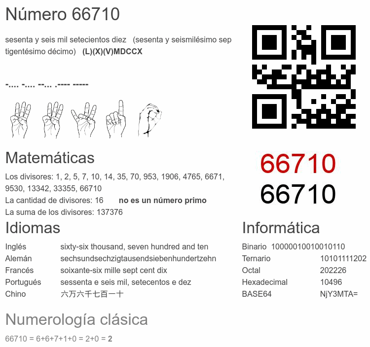 | Francés: | 🔊 (nombre 66 710) | soixante-six mille sept cent dix |
