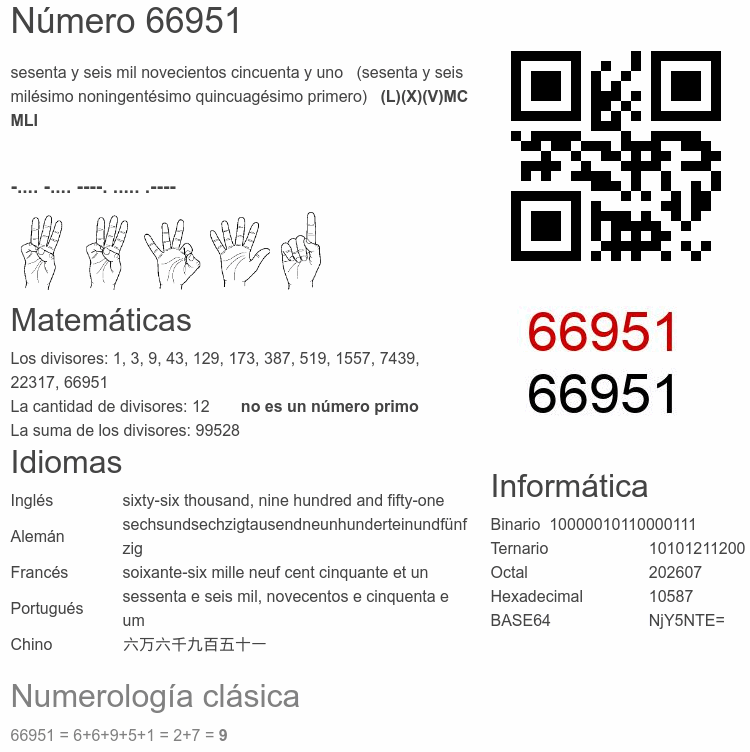 Si conoce algo interesante sobre el número 66951 o cualquier número natural (entero positivo), por favor escríbanos.Número 66 951 en otras unidades