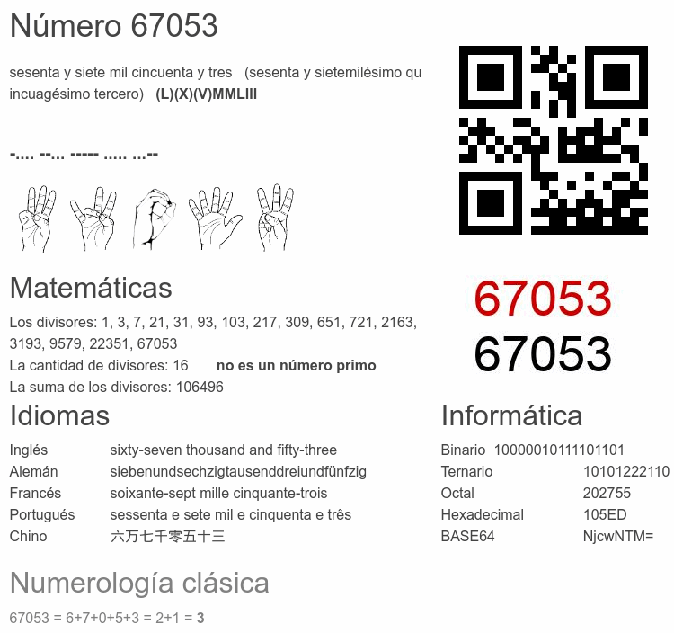 Si conoce algo interesante sobre el número 67053 o cualquier número natural (entero positivo), por favor escríbanos.Número 67 053 en otras unidades