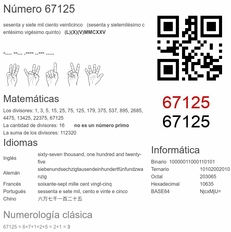 Si conoce algo interesante sobre el número 67125 o cualquier número natural (entero positivo), por favor escríbanos.Número 67 125 en otras unidades