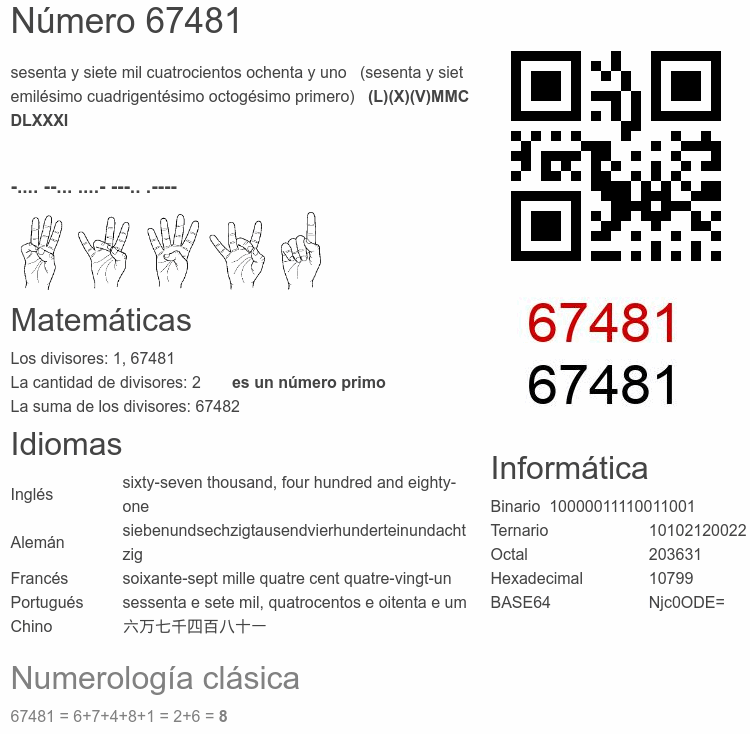 El numero 67481 es un número primo. Los números primos más cercanos son 67477, 67489.