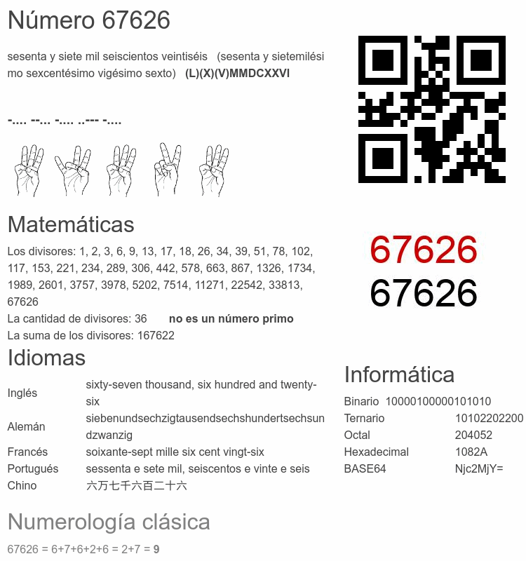 Si conoce algo interesante sobre el número 67626 o cualquier número natural (entero positivo), por favor escríbanos.Número 67 626 en otras unidades