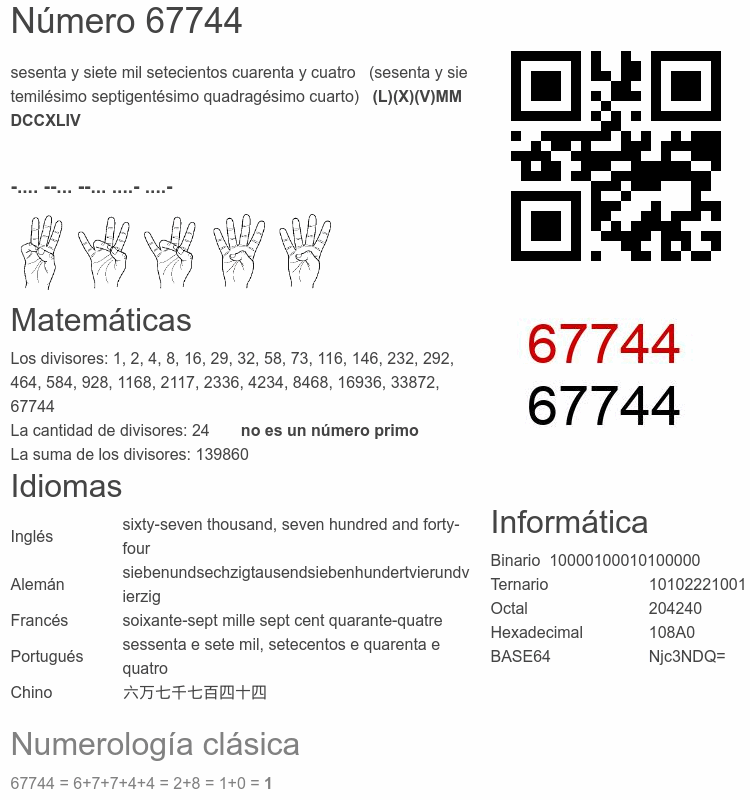 Si conoce algo interesante sobre el número 67744 o cualquier número natural (entero positivo), por favor escríbanos.Número 67 744 en otras unidades