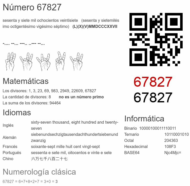 El número impar 67 827 se dice 🔊, y se escribe con las palabras: sesenta y siete mil ochocientos veintisiete. El número ordinal 67827.° se dice 🔊 y se escribe como: sesenta y sietemilésimo octigentésimo vigésimo séptimo. El significado del número 67827 en Matemáticas: Es un primo? Factorización y árbol de factores primos. La raíz cuadrada de y la raíz cúbica de 67827. El significado en informática, numerología, códigos e imágenes, escritura y denominación en otras lenguas. Otras curiosidades relacionadas con el 67827.