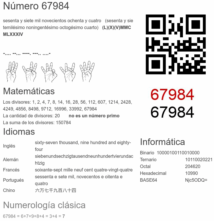 Si conoce algo interesante sobre el número 67984 o cualquier número natural (entero positivo), por favor escríbanos.Número 67 984 en otras unidades