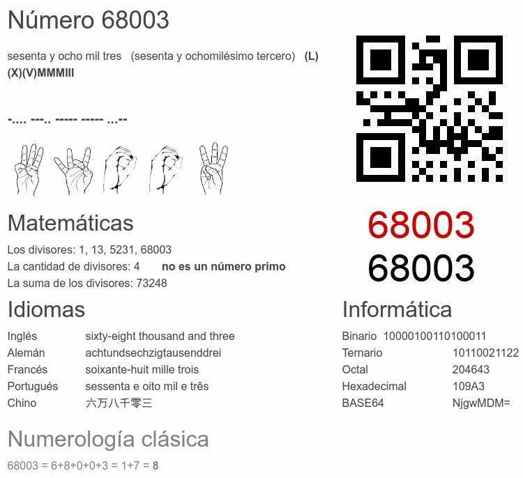Si conoce algo interesante sobre el número 68003 o cualquier número natural (entero positivo), por favor escríbanos.Número 68 003 en otras unidades