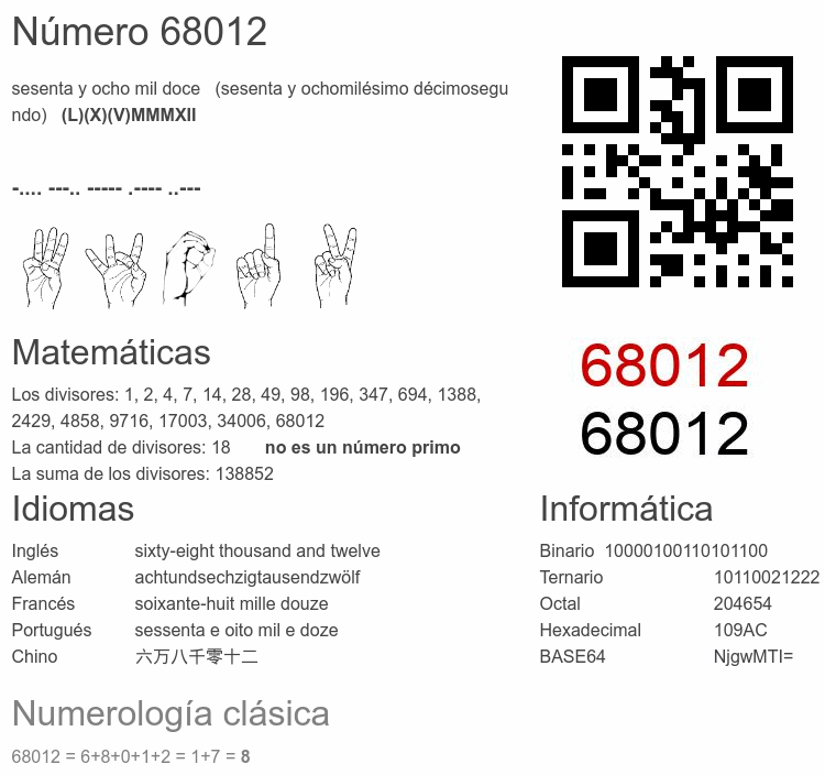 Si conoce algo interesante sobre el número 68012 o cualquier número natural (entero positivo), por favor escríbanos.Número 68 012 en otras unidades