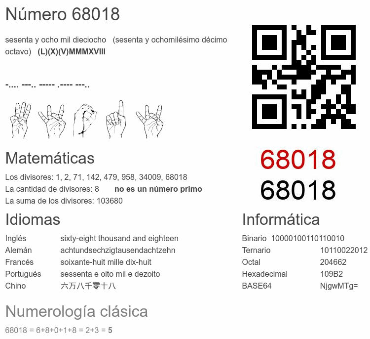 Si conoce algo interesante sobre el número 68018 o cualquier número natural (entero positivo), por favor escríbanos.Número 68 018 en otras unidades