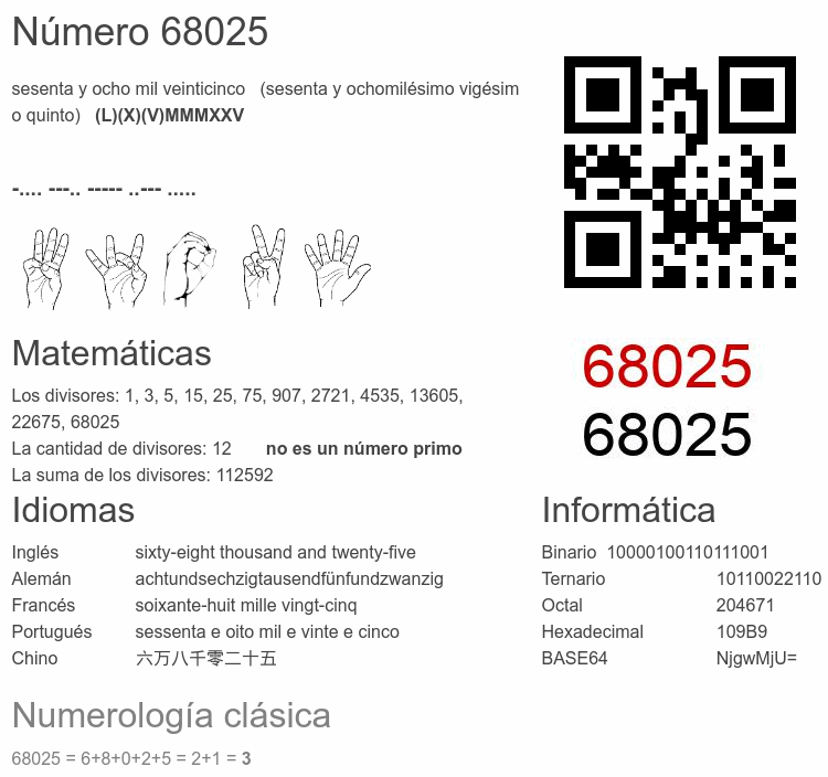 | Francés: | 🔊 (nombre 68 025) | soixante-huit mille vingt-cinq |