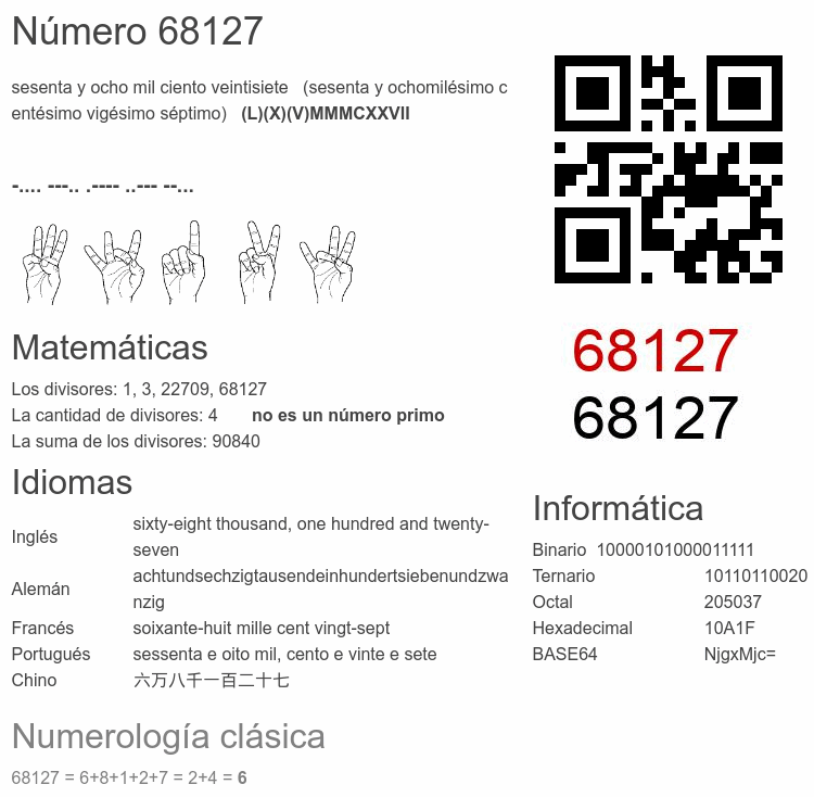 Si conoce algo interesante sobre el número 68127 o cualquier número natural (entero positivo), por favor escríbanos.Número 68 127 en otras unidades