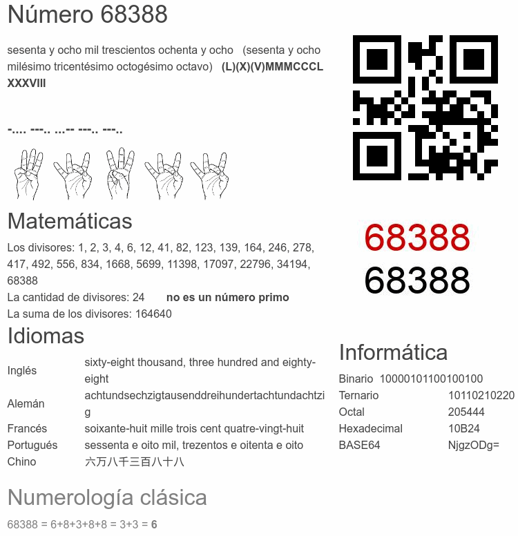 Si conoce algo interesante sobre el número 68388 o cualquier número natural (entero positivo), por favor escríbanos.Número 68 388 en otras unidades