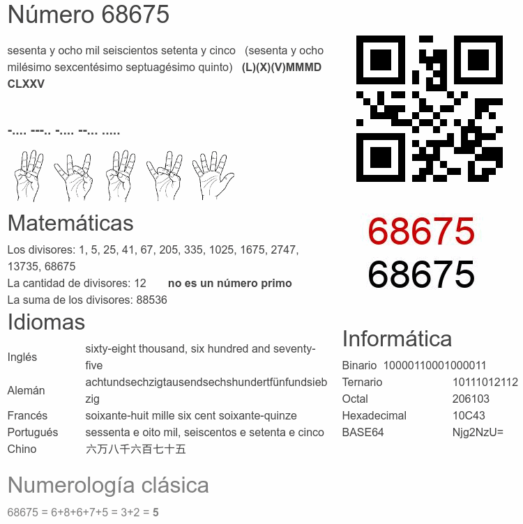 Si conoce algo interesante sobre el número 68675 o cualquier número natural (entero positivo), por favor escríbanos.Número 68 675 en otras unidades