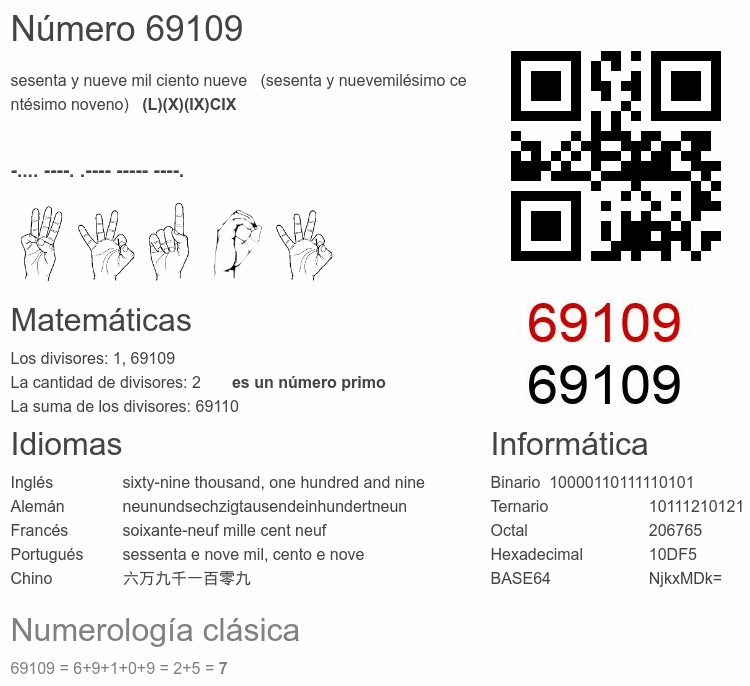 Si conoce algo interesante sobre el número 69109 o cualquier número natural (entero positivo), por favor escríbanos.Número 69 109 en otras unidades