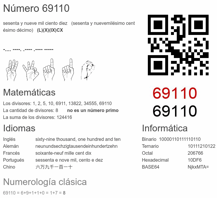 Si conoce algo interesante sobre el número 69110 o cualquier número natural (entero positivo), por favor escríbanos.Número 69 110 en otras unidades