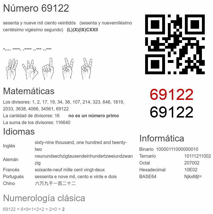 Si conoce algo interesante sobre el número 69122 o cualquier número natural (entero positivo), por favor escríbanos.Número 69 122 en otras unidades