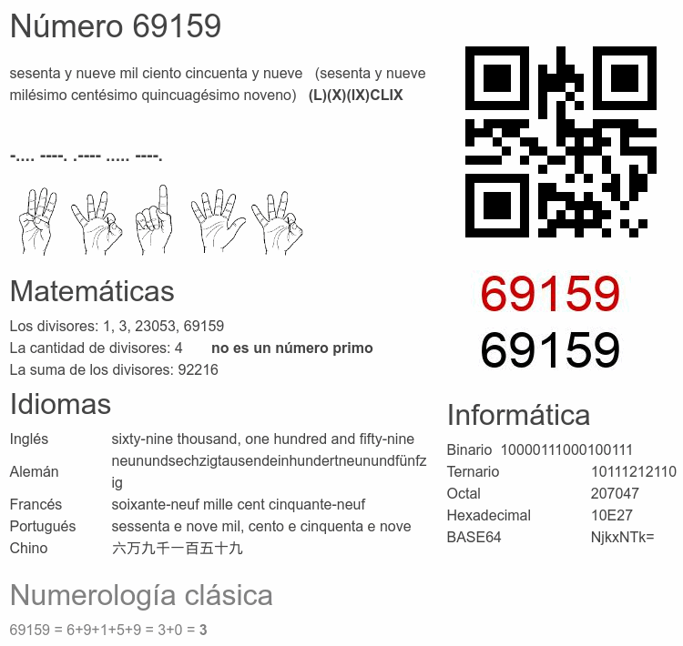 Si conoce algo interesante sobre el número 69159 o cualquier número natural (entero positivo), por favor escríbanos.Número 69 159 en otras unidades
