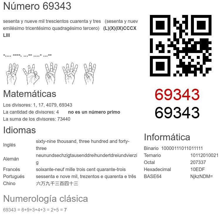 Si conoce algo interesante sobre el número 69343 o cualquier número natural (entero positivo), por favor escríbanos.Número 69 343 en otras unidades