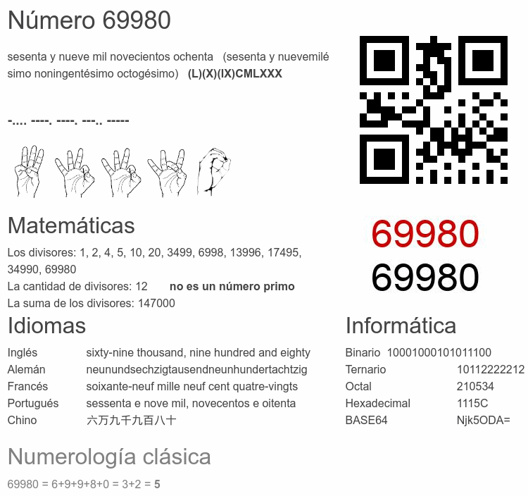 Si conoce algo interesante sobre el número 69980 o cualquier número natural (entero positivo), por favor escríbanos.Número 69 980 en otras unidades