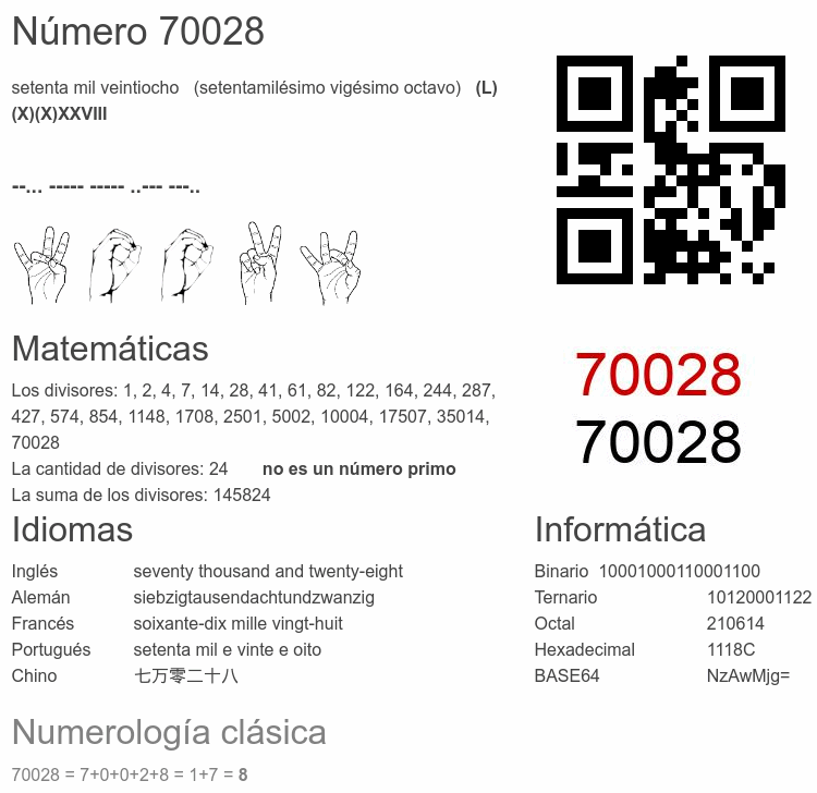 Si conoce algo interesante sobre el número 70028 o cualquier número natural (entero positivo), por favor escríbanos.Número 70 028 en otras unidades