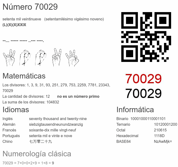 Si conoce algo interesante sobre el número 70029 o cualquier número natural (entero positivo), por favor escríbanos.Número 70 029 en otras unidades