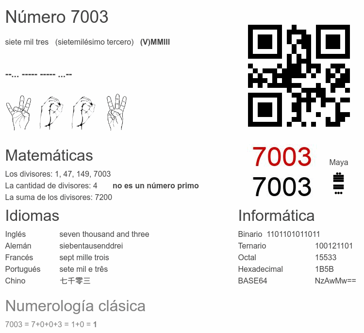 El número impar 7 003 se dice 🔊, y se escribe con las palabras: siete mil tres. El número ordinal 7003.° se dice 🔊 y se escribe como: sietemilésimo tercero. El significado del número 7003 en Matemáticas: Es un primo? Factorización y árbol de factores primos. La raíz cuadrada de y la raíz cúbica de 7003. El significado en informática, numerología, códigos e imágenes, escritura y denominación en otras lenguas. Otras curiosidades relacionadas con el 7003.
