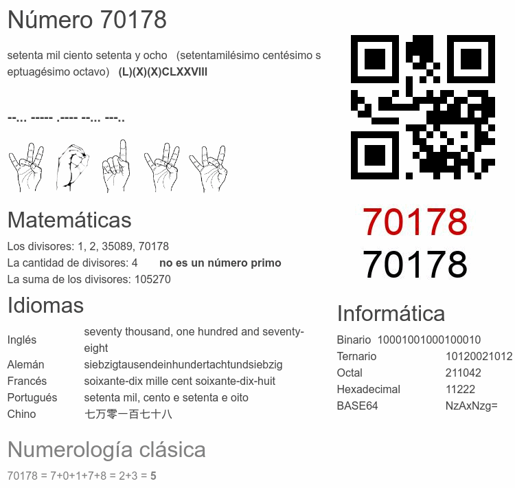 Si conoce algo interesante sobre el número 70178 o cualquier número natural (entero positivo), por favor escríbanos.Número 70 178 en otras unidades