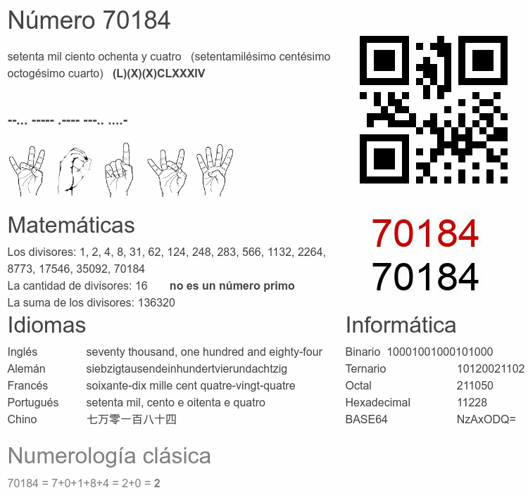 Si conoce algo interesante sobre el número 70184 o cualquier número natural (entero positivo), por favor escríbanos.Número 70 184 en otras unidades