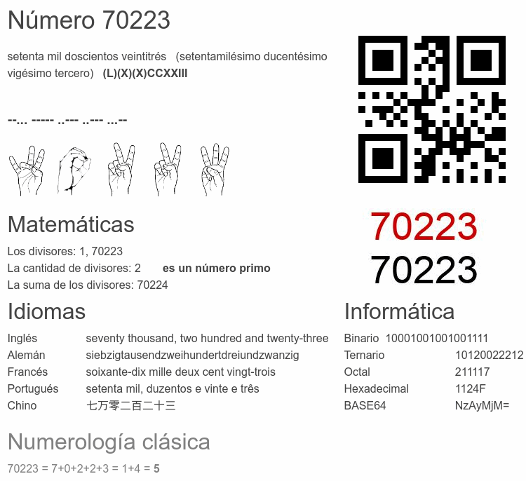 Si conoce algo interesante sobre el número 70223 o cualquier número natural (entero positivo), por favor escríbanos.Número 70 223 en otras unidades