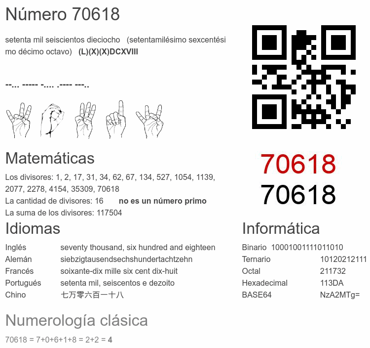 Si conoce algo interesante sobre el número 70618 o cualquier número natural (entero positivo), por favor escríbanos.Número 70 618 en otras unidades