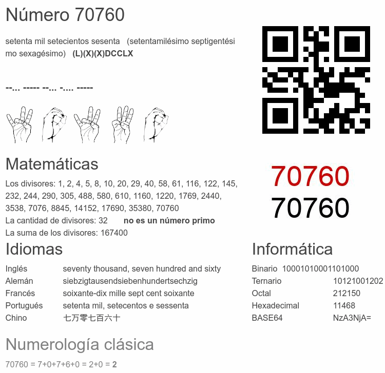 Si conoce algo interesante sobre el número 70760 o cualquier número natural (entero positivo), por favor escríbanos.Número 70 760 en otras unidades