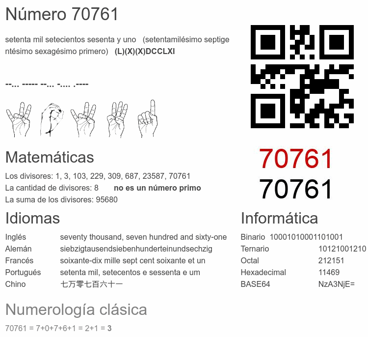 Si conoce algo interesante sobre el número 70761 o cualquier número natural (entero positivo), por favor escríbanos.Número 70 761 en otras unidades