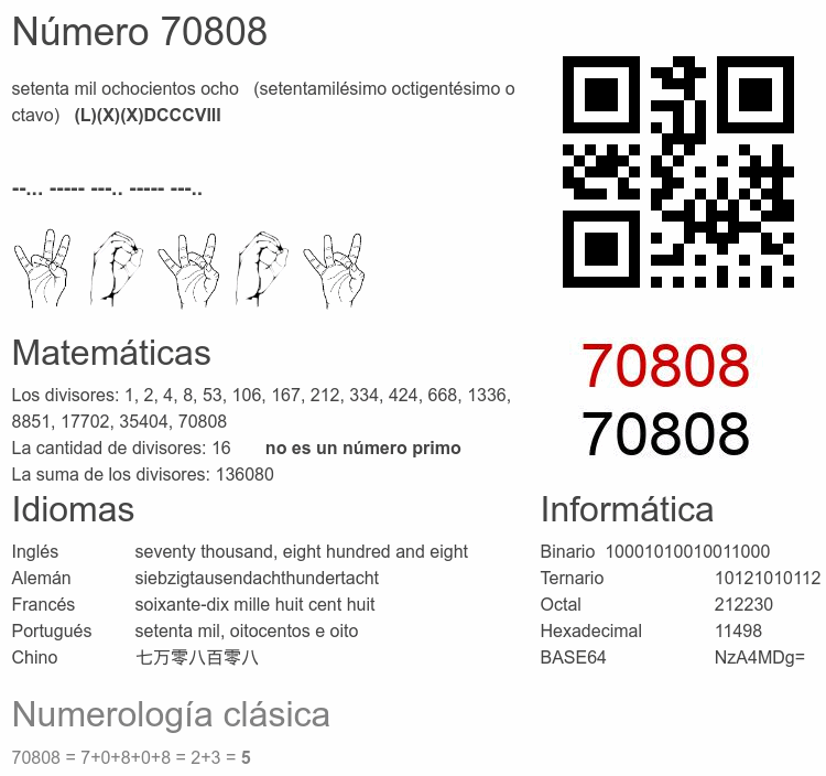Si conoce algo interesante sobre el número 70808 o cualquier número natural (entero positivo), por favor escríbanos.Número 70 808 en otras unidades