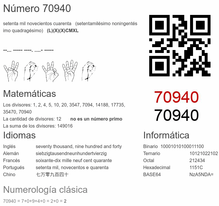 Si conoce algo interesante sobre el número 70940 o cualquier número natural (entero positivo), por favor escríbanos.Número 70 940 en otras unidades