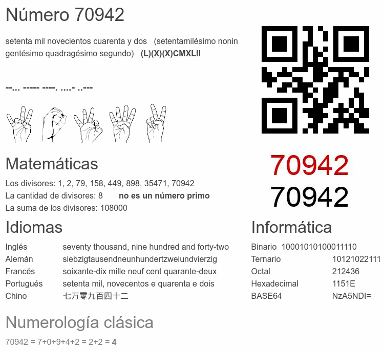 Si conoce algo interesante sobre el número 70942 o cualquier número natural (entero positivo), por favor escríbanos.Número 70 942 en otras unidades
