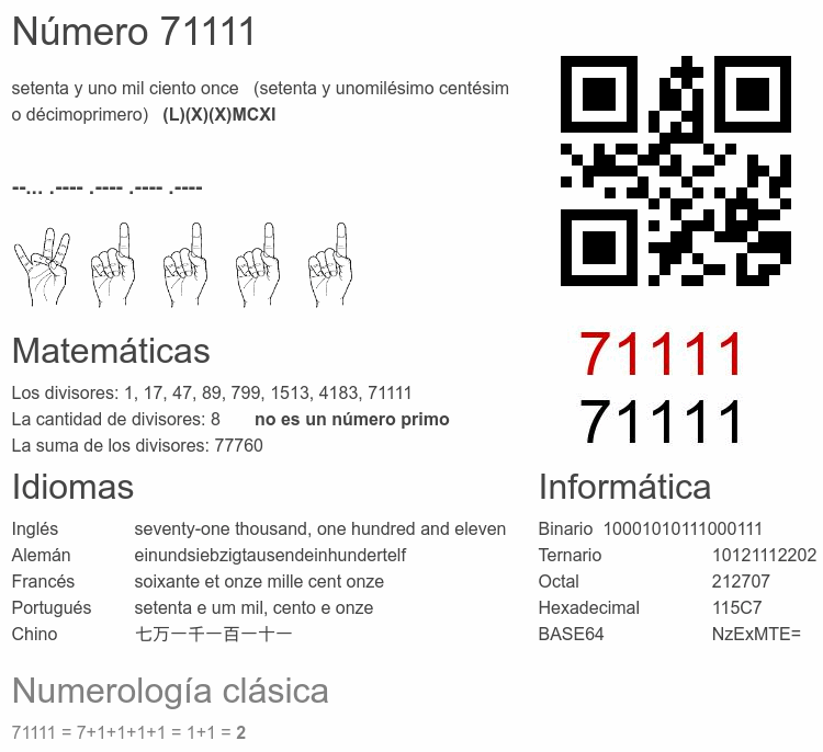 El número impar 71 111 se dice 🔊, y se escribe con las palabras: setenta y uno mil ciento once. El número ordinal 71111.° se dice 🔊 y se escribe como: setenta y unomilésimo centésimo décimoprimero. El significado del número 71111 en Matemáticas: Es un primo? Factorización y árbol de factores primos. La raíz cuadrada de y la raíz cúbica de 71111. El significado en informática, numerología, códigos e imágenes, escritura y denominación en otras lenguas. Otras curiosidades relacionadas con el 71111.