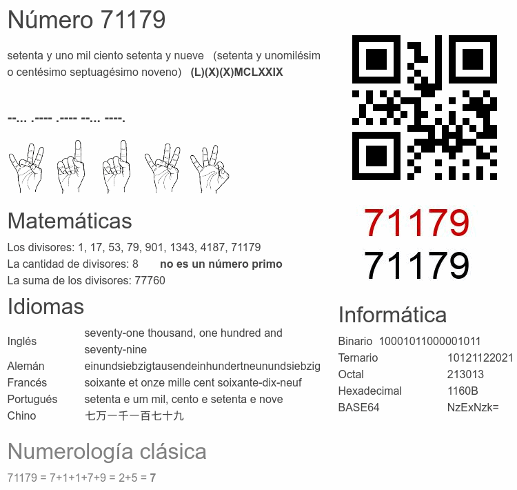 Si conoce algo interesante sobre el número 71179 o cualquier número natural (entero positivo), por favor escríbanos.Número 71 179 en otras unidades