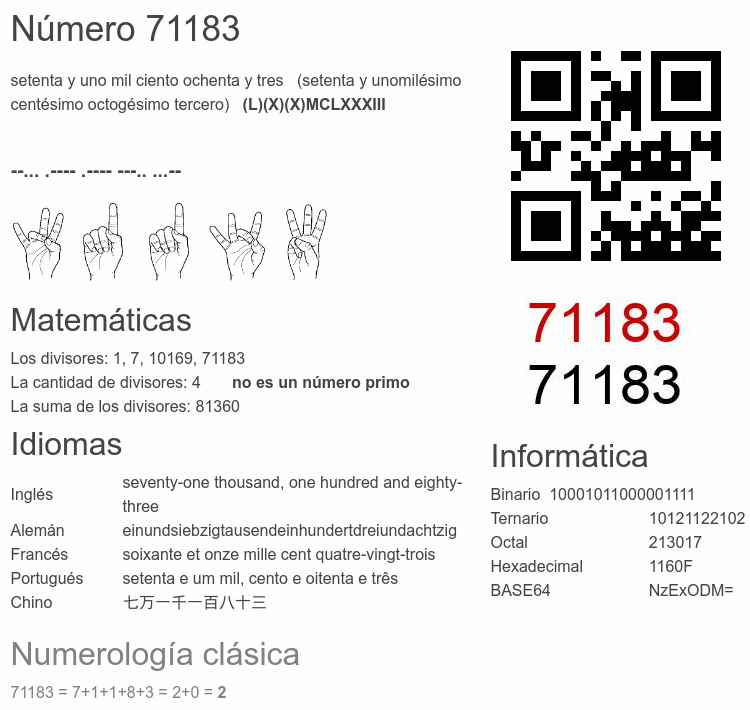 Si conoce algo interesante sobre el número 71183 o cualquier número natural (entero positivo), por favor escríbanos.Número 71 183 en otras unidades